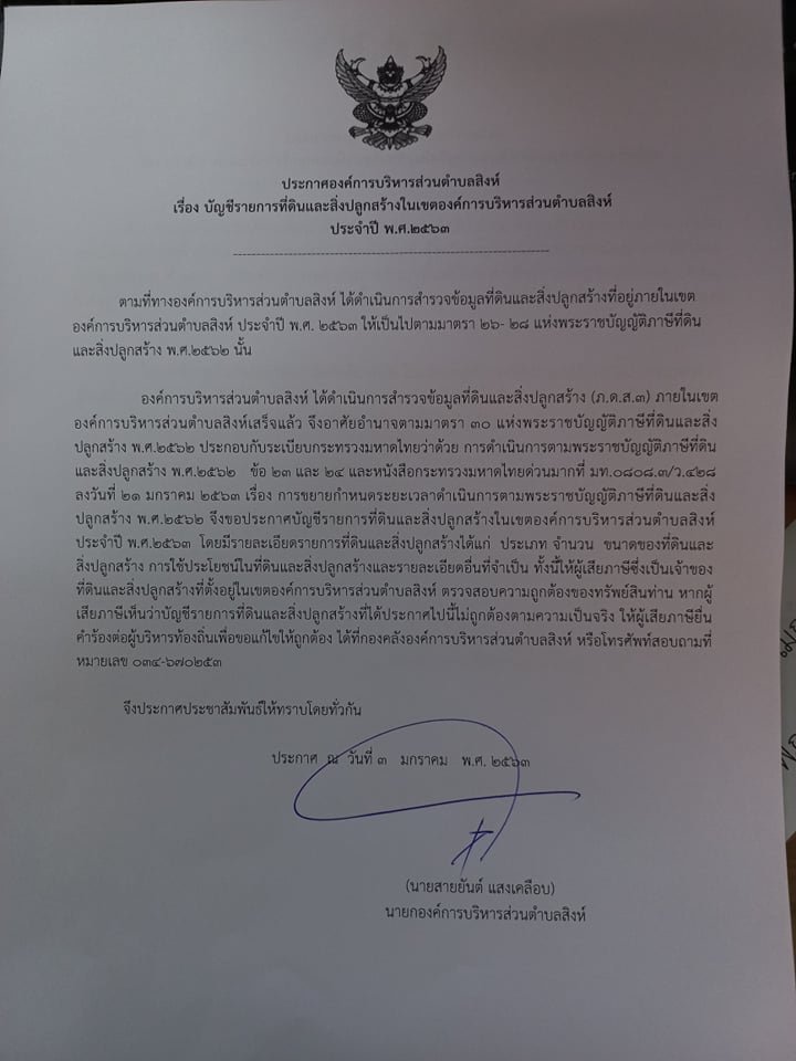 เรื่อง บัญชีรายการที่ดินและสิ่งปลูกสร้างในเขตองค์การบริหารส่วนตำบลสิงห์ ภดส.3 ประจำปี พ.ศ.2563ประกาศองค์การบริหารส่วนตำบลสิงห์ เรื่อง ขยายเวลาดำเนินการตามพระราชบัญญัติภาษีที่ดินและสิ่งปลูกสร้างประจำปี พ.ศ.2563